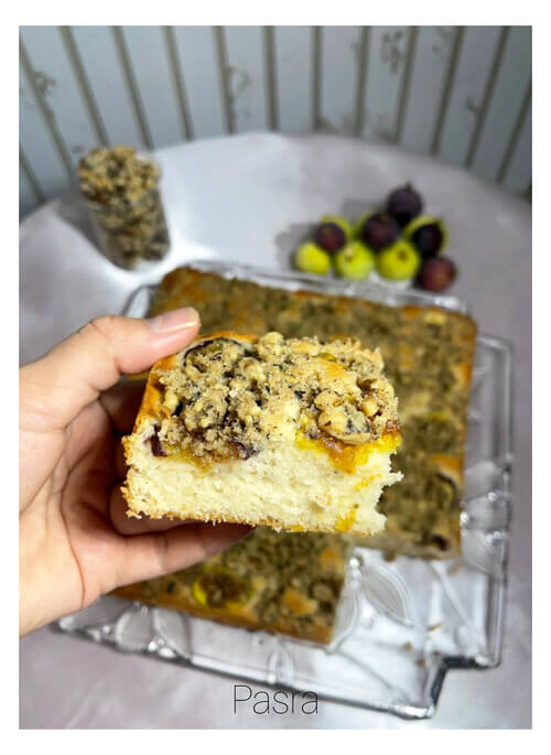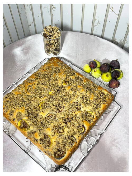 برش های از انجیر روی سطح، پخته در لطافت کیک پوشیده از کرامبل گردو تُرد —برای تضاد بافت و طعمی گرم و اصیل یه کیک مینیمال با جلوهای باغی و رایحهای نوستالژیک—هر برش، ترکیبی از لطافت میوه و تُردی مغزها 🤍🍂